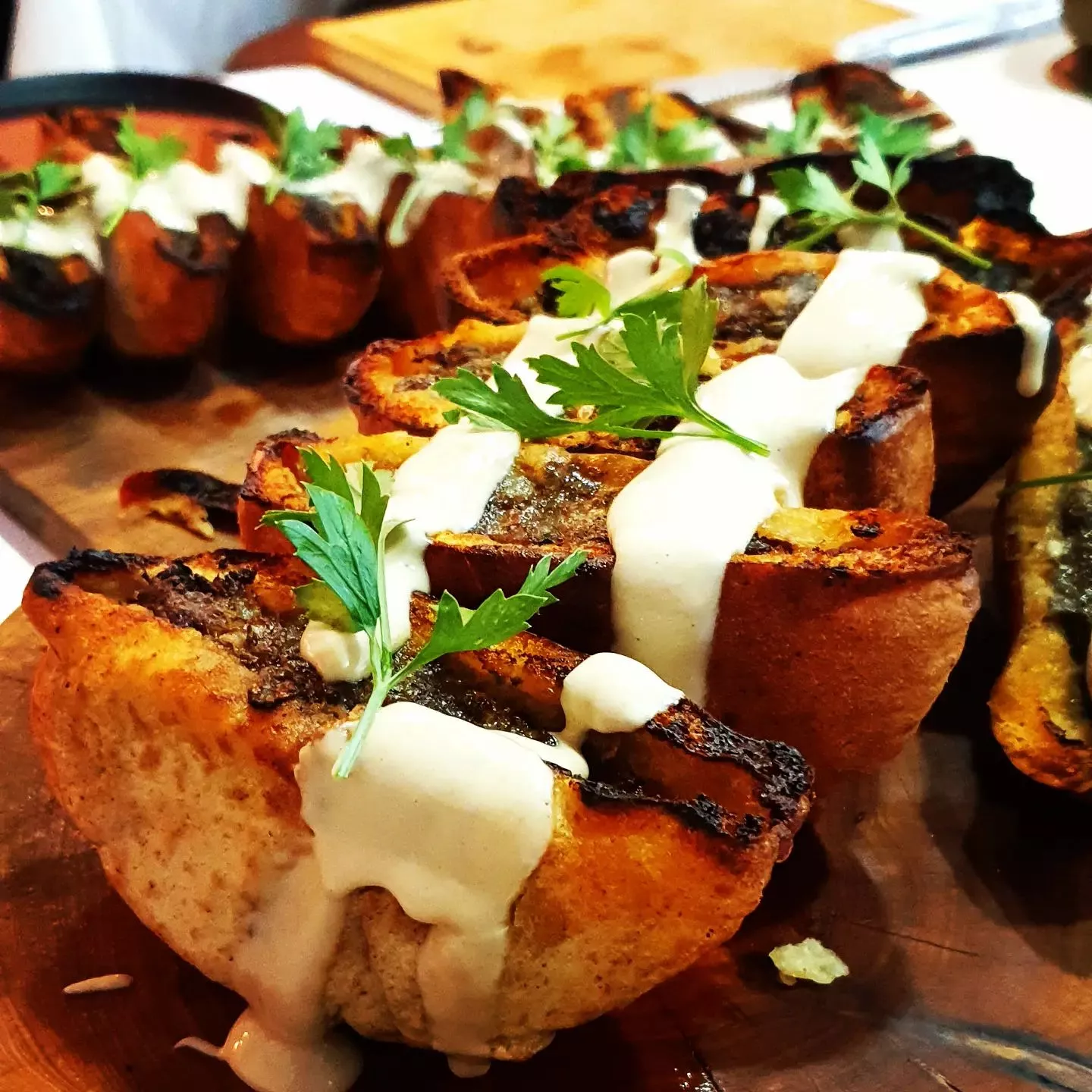 להכין מסת קציצות עם ליה של שומן כבש ולמלא את הפיתות, לשים על האש ולצלות כמה דקות בכל צד עד שהבשר מוכן, לשפוך מעל טחינה ולהגיש עם צ'ימיצ'ורי בצד.
